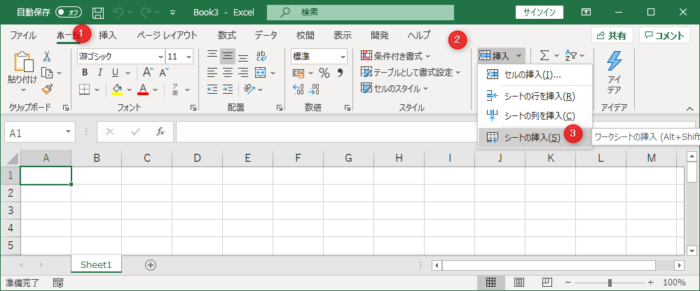 [ホーム]→[挿入]→[シートの挿入]をクリック