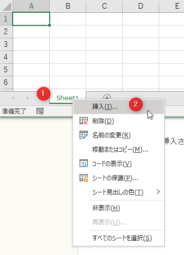 「Sheet1」を右クリック→[挿入]をクリック