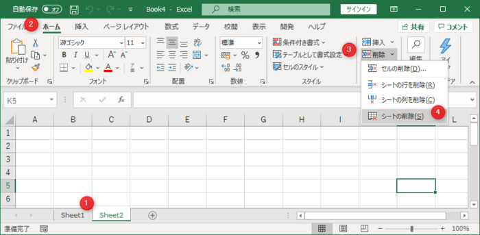 「Sheet2」をクリック→[ホーム]→[削除]→[シートの削除]をクリック