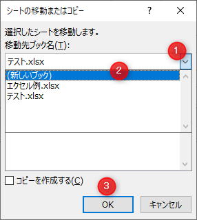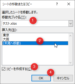 [テスト.xlsx]→(末尾へ移動)→[コピーを作成する]にチェック→[OK]をクリック