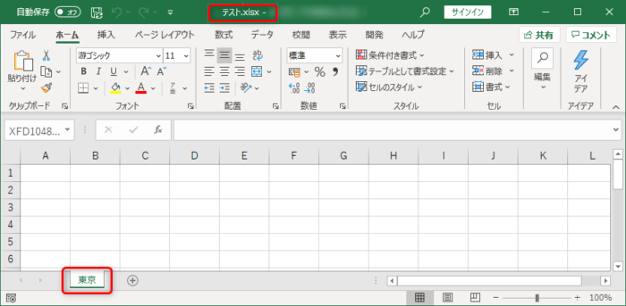 元のファイル「テスト.xlsx」には「大阪」ワークシートが削除され、「東京」ワークシートだけになった