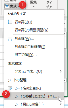[ホーム]→[書式]→[シートの移動またはコピー]でも同様に指定可能です。