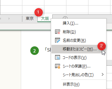 [大阪]シートを右クリック→[移動またはコピー]をクリック