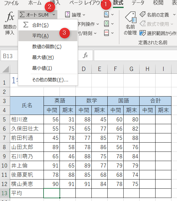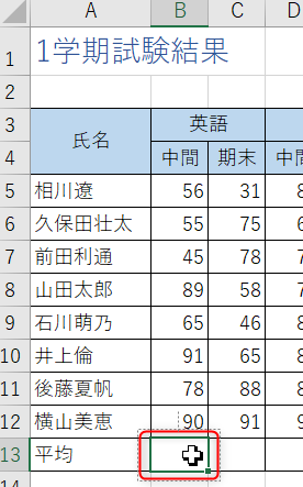 英語 中間の平均のセル「B13」をクリックして選択
