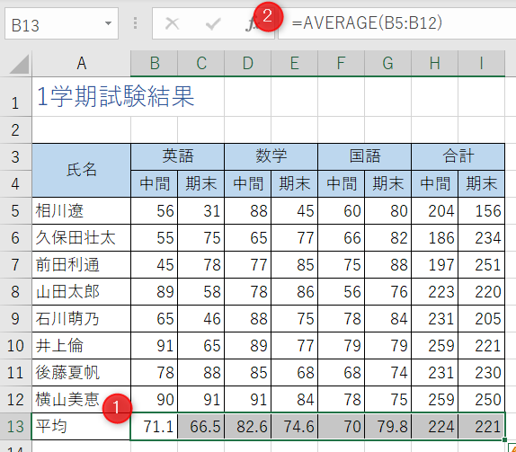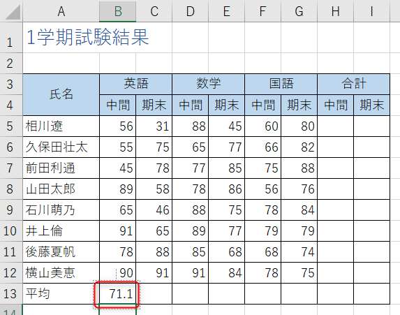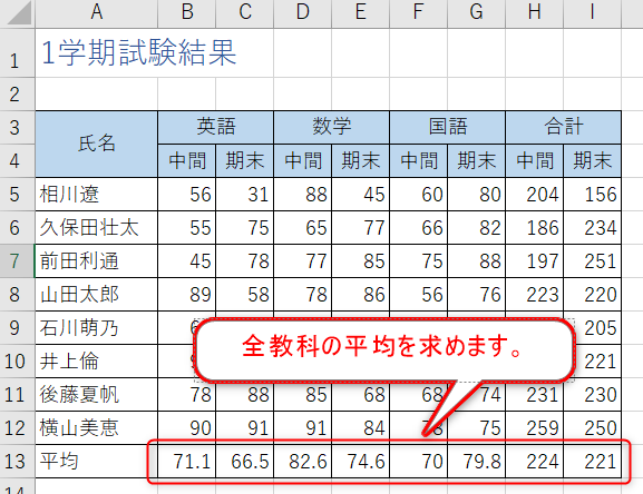 完成例セル[B13]から[I13]に各教科の平均を求めます。