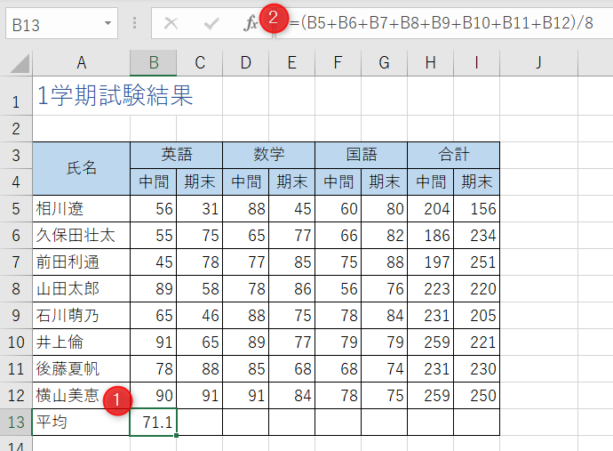 セル[B13]をクリックし、「=(B5+B6+B7+B8+B9+B10+B11+B12)/8」と入力