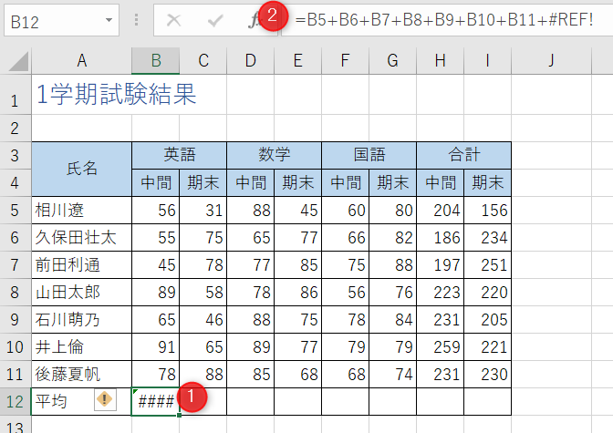 [B12]をクリック、数式バーに「=B5+B6+B7+B8+B9+B10+B11+#REF!」と入力されている