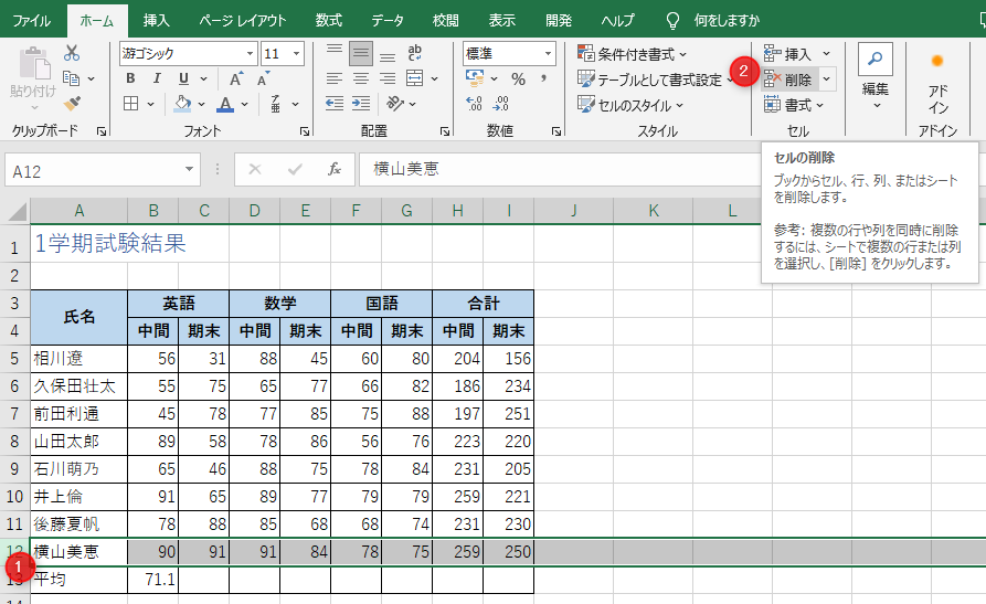AVERAGE関数で平均点を求め、行を削除してみましょう。