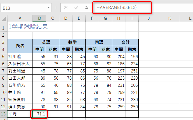 セル[B13]にAVERAGE関数で平均点を求める式を入力しておく