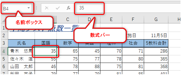 セル番地[B4]をクリックしてみましょう。すると名前ボックスには選択したセル番地である「B4」が表示されます。この時、数式バーには「35」と表示され文字や数式の入力をすることが可能です。