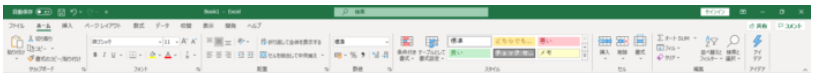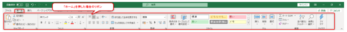 [ホーム]をクリックするとこのリボンになります。[ホーム]はExcel起動後に最初から表示されています。