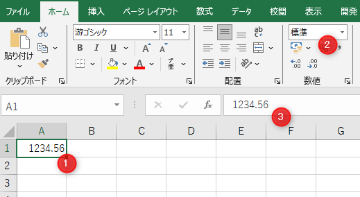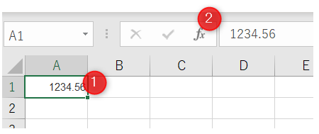 ①セル[A1]に「1234.56」と入力、②数式バーに「1234.56」と入力されていることを確認