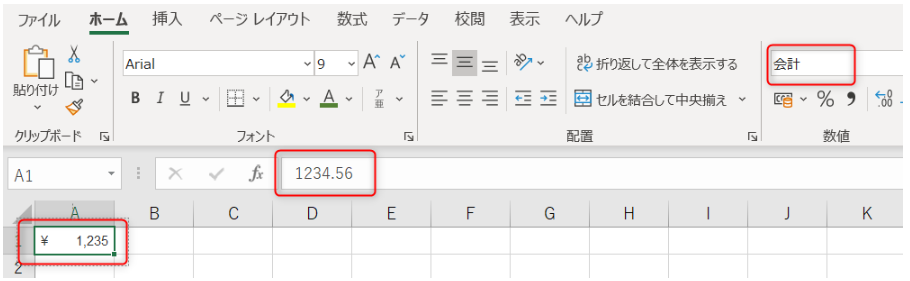 会計形式になると四捨五入され、自動で「¥」マークがつき、3桁区切りになります。