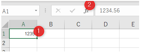 「1235」になり②数式バーには「1234.56」と入力されたままなことを確認