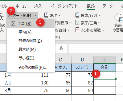 セル[E2]を選択、[数式]→[オートSUM]→[合計]をクリック