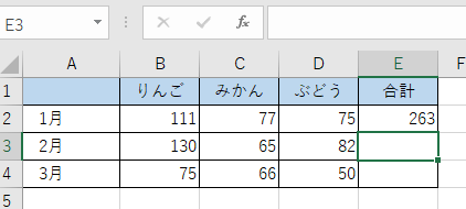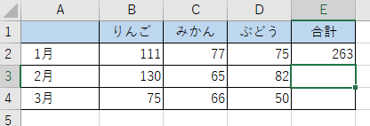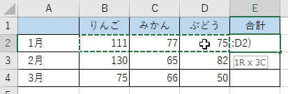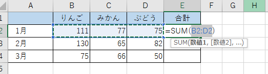 [B2]から[D2]が自動選択され、セル[E1]に「=SUM(B2:D2)」と入力される