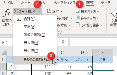 セル[E2]を選択、[数式]→[オートSUM]→[その他の関数]をクリック
