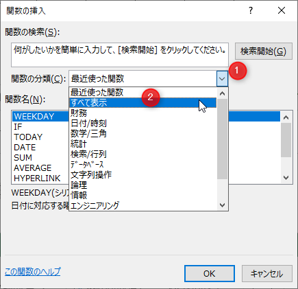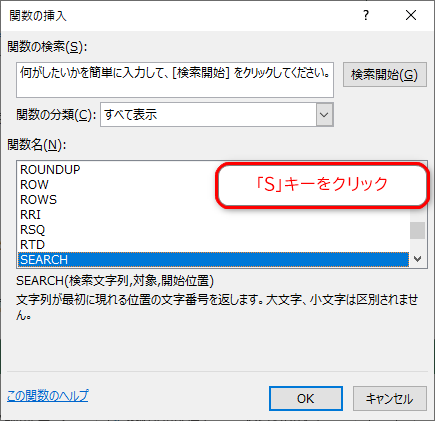 関数の分類の下向き矢印→[すべて表示]を選択→キーボードの半角で「S」を押すと②「S」から始まる関数名にジャンプする