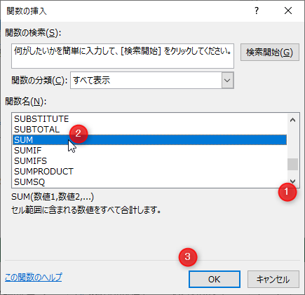 下にスクロールダウンして「SUM」を探す→[SUM]をクリック→[OK]をクリック