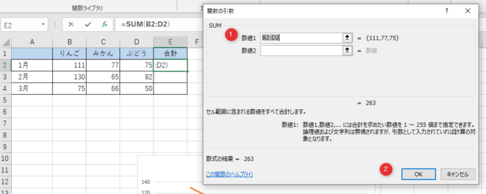 「SUM」関数の引数指定ダイヤログが表示され「数値1」にB2:D2が入力されていることを確認→[OK]をクリック