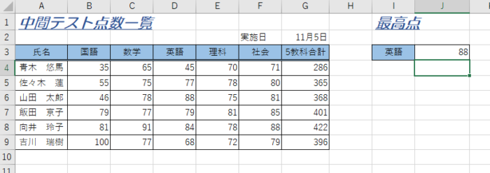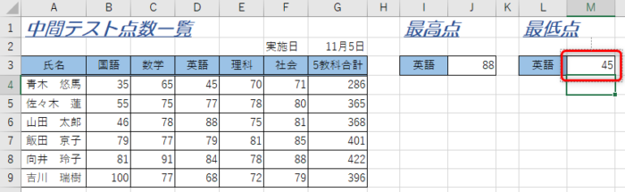 完成例セル「J3」に英語の最低点を求めます。