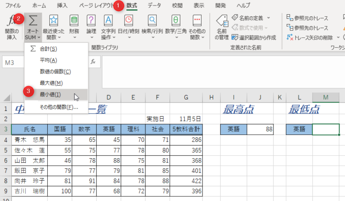 英語最低点を表示したいセル「M3」をクリックして選択