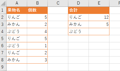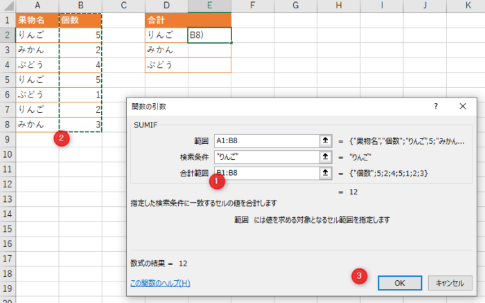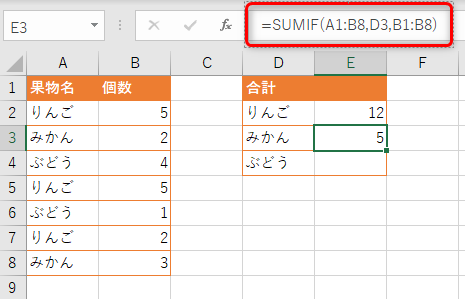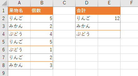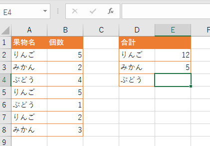「りんご」の合計「12」と計算された→この時数式バーには今設定した数式が入っている