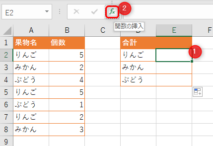 「りんご」のセル「 E2 」をクリックして選択し、関数の挿入ボタンをクリック
