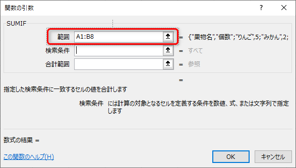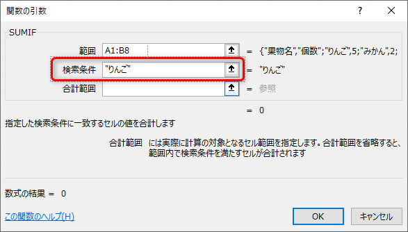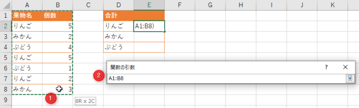 「合計範囲」や「範囲」の四角い入力欄をを押すと「”りんご”」と表示が変わる