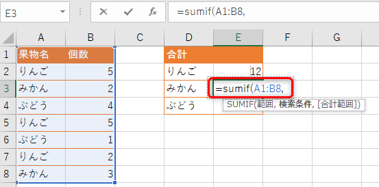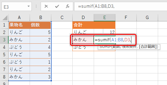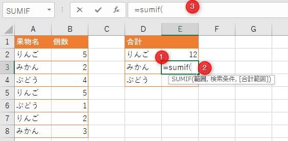 E3セルをクリック→「=sumif(」と入力→数式バーにも表示されているのがわかる