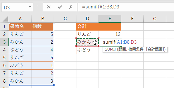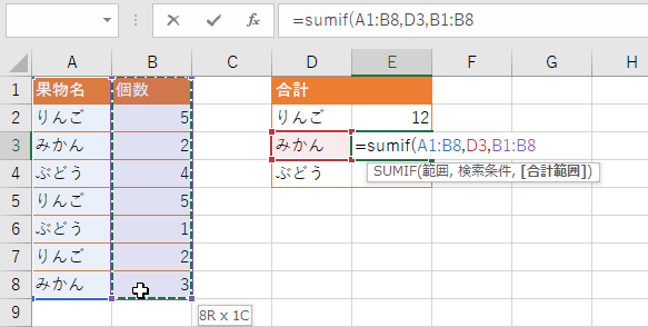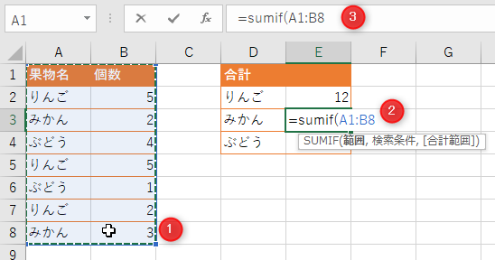 「範囲」としてセルA1からB8をドラッグ→「=sumif(A1:B8」と自動入力される→数式バーにも自動入力される