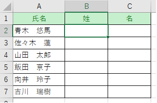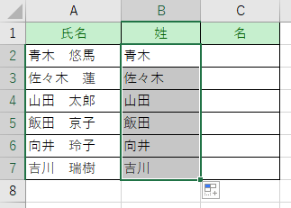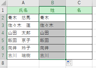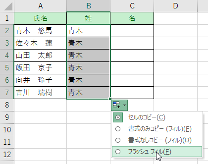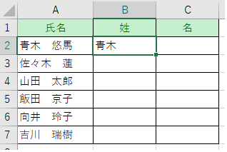 「青木」と入力し、それ以下のセルに自動で姓を取り出します。