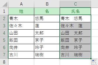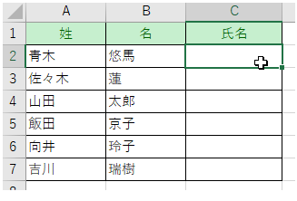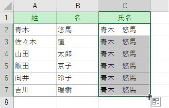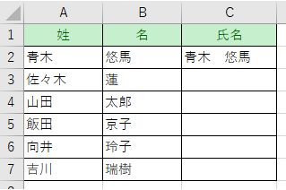 「青木 悠馬」と入力し、それ以下のセルに自動で姓と名を結合します。