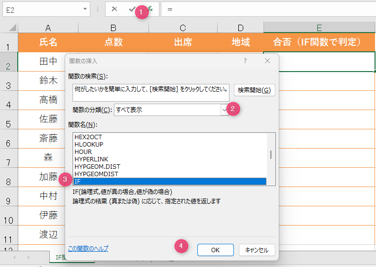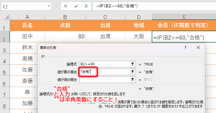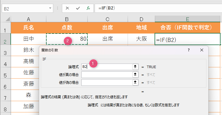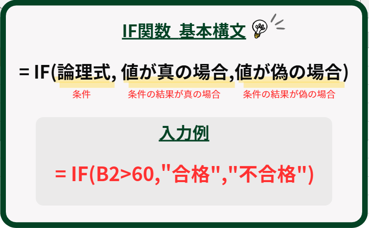 =IF(①論理式, ②条件が真の場合, ③偽の場合)