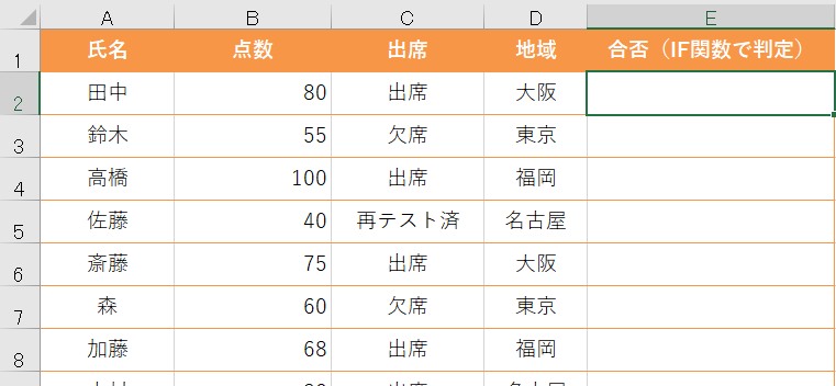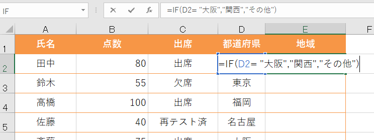 「=IF(D2="大阪","関西","その他")と入力しEnterを押す