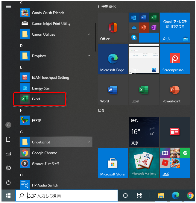 ※右側のタイル(四角い部分)にExcelが表示されている場合はこちらをクリックでも起動します。