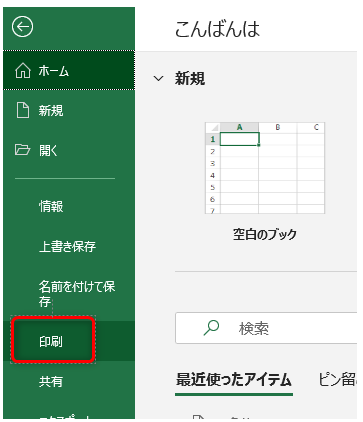 バックステージビューが表示されるので[印刷]をクリック