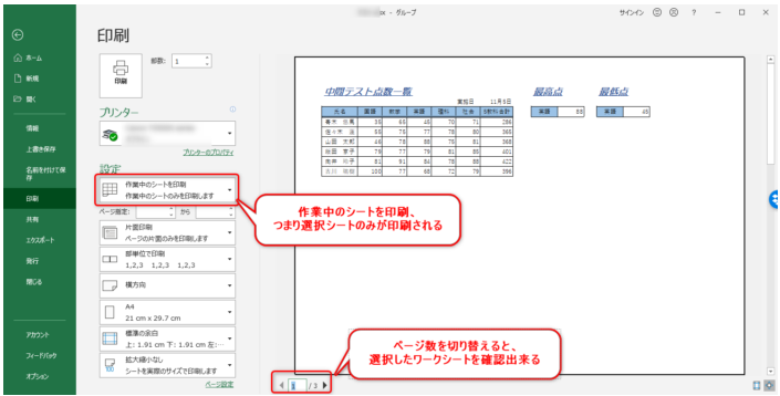 「1組」「3組」のシートをまとめて印刷します。