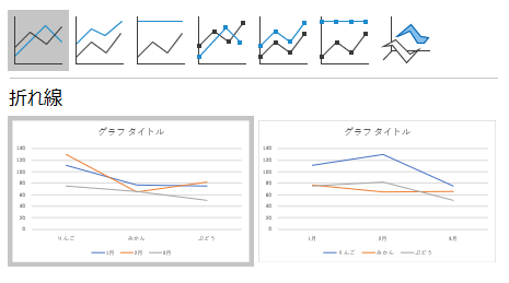 上記同様に折れ線グラフを選択すると、折れ線グラフが挿入されます。