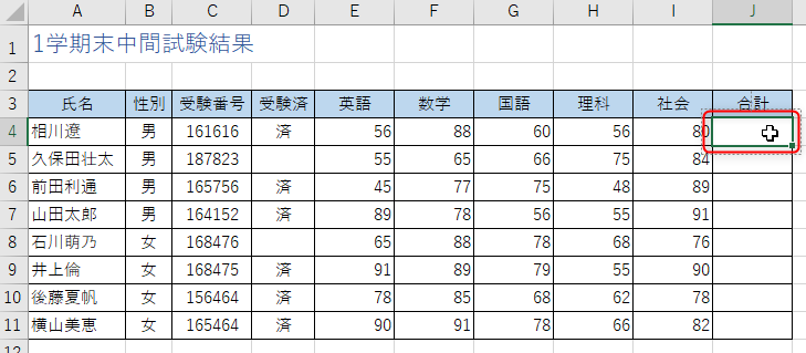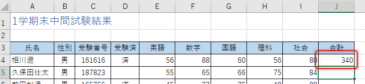 完成例セル「J4」に英語から社会まで5教科の点数の合計を求めます。