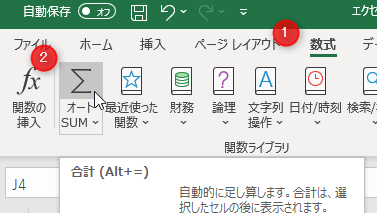 合計したい対象セルが自動選択され、「J4」には数式「=SUM(E4:I4)」と自動入力されます