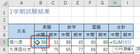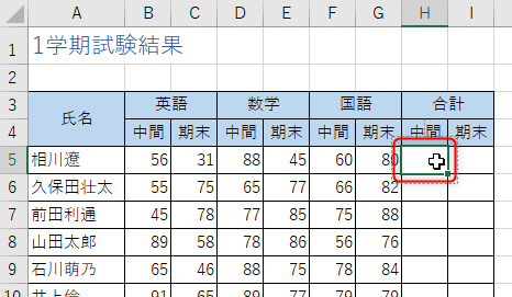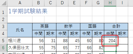 完成例セル「H5」に英語、数学、国語の中間テストの点数の合計を求めます。