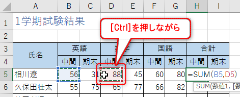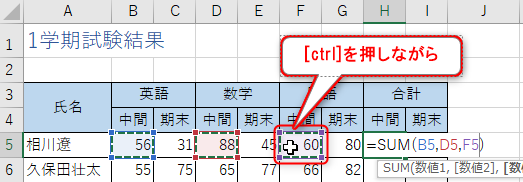 ctrlキーを押しながら「数学 中間」のセル「D5」をクリック