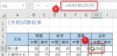 ①セル「H5」をクリック→②数式バーに「=SUM(B5,D5,F5)」と入力されているのがわかります